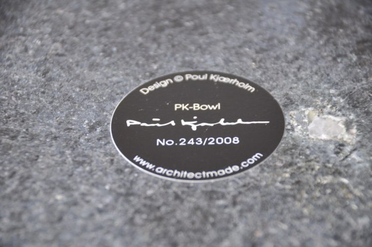 I 1963 indrettede Poul Kjærholm rådhuset i den danske byen Fredericia. Blandt de møbler, han er special designede var et stort marmor askebæger. Askebæret der står på Fredericia rådhus måler 30x60x60 cm. og vejer omkring 250 kg. Senere samme år, designede Kjærholm en mindre version i granit til den almindelige husholdning, som du kan købe her idag. PK Bowl er nummereret og signeret i bunden.