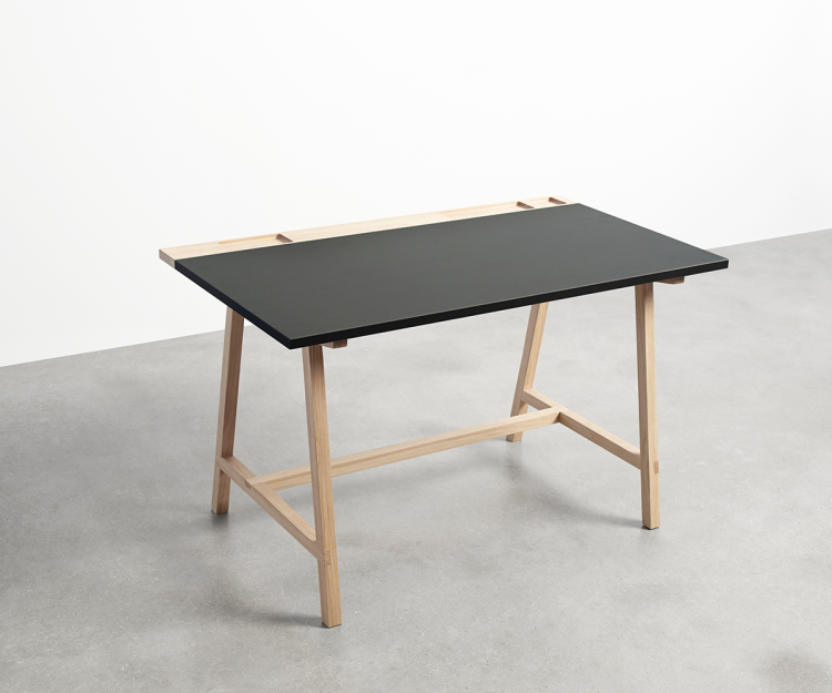 Bordet er fremstillet med praktisk linoleumsplade og understellet er i massivt eg.