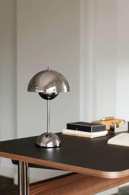 Flowerpot VP9 Portable er en fin lille bærbar bordlampe, der er en smule mindre end sin storebror VP3 Bordlampen. Du kan frit vælge imellem 10 farver og sætte dit eget præg på stemningen rundt i huset eller på terrassen. Den trådløse bordlampe har en tre trins lysdæmper som du styrer via kuglen på toppen af lampen, så man ved fuld styrke f.eks. kan læse en god bog eller ved lav styrke kan skabe en stemningsfuld hyggebelysning. Lampen kan ved fuld opladning lyse i op til 11 timer. Batteriet i bordlampen er let at lade med det medfølgende opladerkabel.