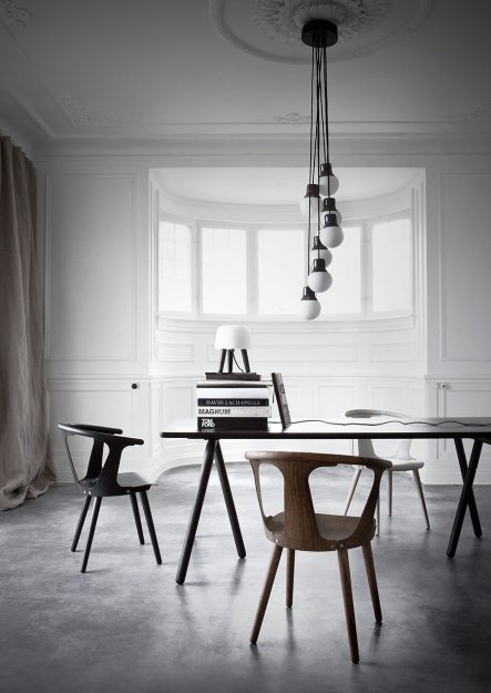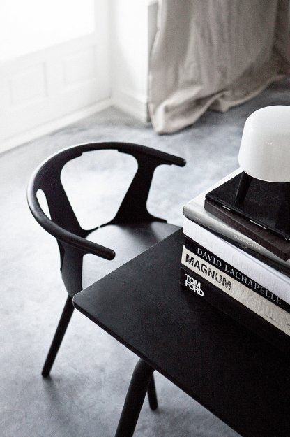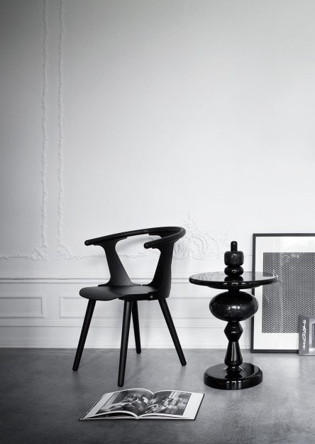 Samspillet mellem det positive og negative rum er central for In Between stolen, designet af Sami Kallio for &tradition. In Between er produceret ved hjælp af to klassiske teknikker: kompressionsstøbning (hvilket gør stolen let og tyndt men alligevel stærk) og woodturning (en teknik, der bruger en drejebænk, for at opnå flere detaljer). In Between fås med og uden polstring med stel i enten hvidolieret eg, røget eg eller sortbejdset ask.
