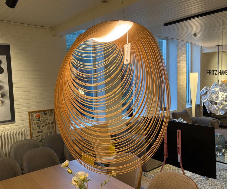 llan Pendelen fra Luceplan er en dekorativ pendel i laserskåret birkefiner med indbygget LED-lys. Lampen svæver i to wires og har en skulpturel form der udover at give et flot lys også fremstår som et unikt og smukt element til din indretning.