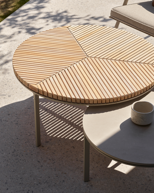 Vipp 716 Open-Air sofabordet er modelleret efter det indendørs Vipp 425 sofabord. Sofabordet består af et trebenet aluminiumsstel med Ø90 bordplade bestående af teaklameller, og byder på et slidstærkt og elegant look til loungeområdet. Det kan kombineres med Vipp 714 Ø60 sofabordet med keramisk overflade.