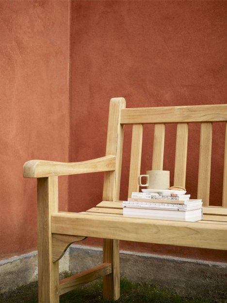 England serien er en moderne fortolkning af et klassisk design med inspiration fra de træbænke, man finder i engelske haver og parker – et venligt og imødekommende formsprog, som inviterer til afslapning. En behagelig siddeplads i haven til to eller tre personer, da bænken fås i to størrelser. Bænken er lavet af ubehandlet teak, hvilket gør, at den med tiden vil patinere til en smuk sølvgrå tone.