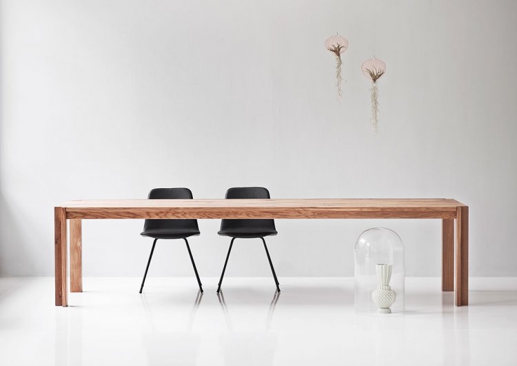 Designet er holdt så minimalistisk som mulig og derved ladet det æstetiske træ, det gode håndværk og den enkelte funktion være centrum. Derfor er bordet imponerende i sig selv, samtidig med at det er samlingspunktet til møder eller i spisestuen.