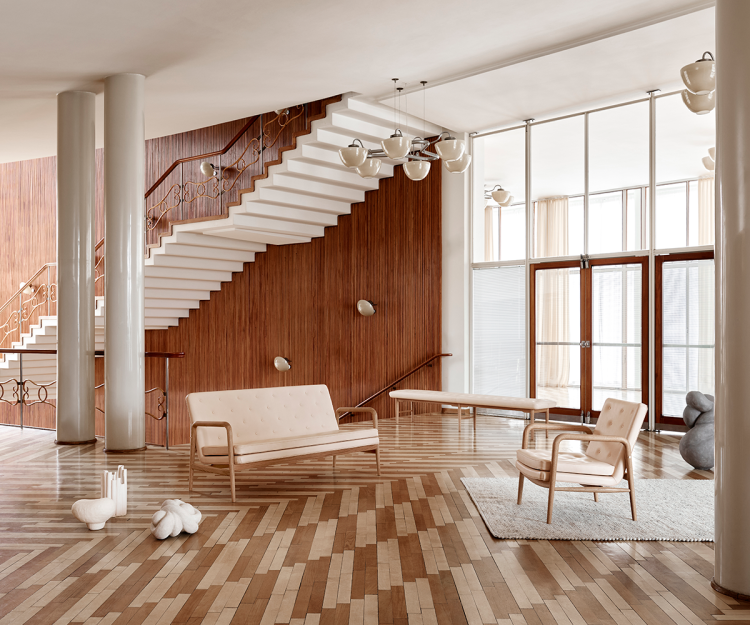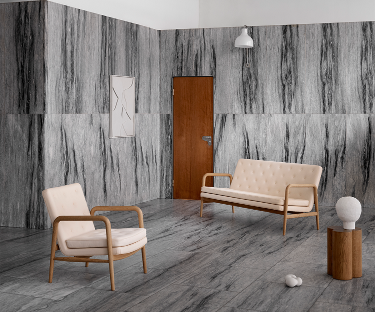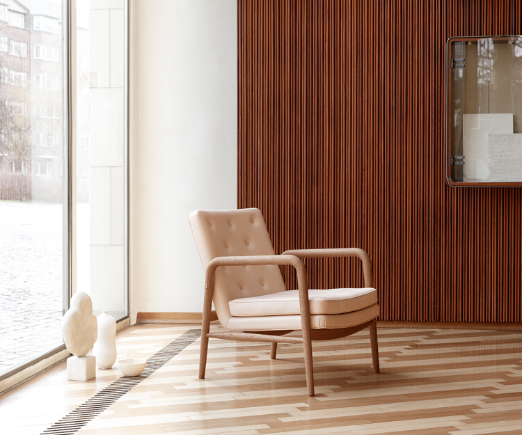 VLA76 Foyer Lænestol. Foyer-serien består af en bænk, en sofa og en lænestol, der alle kendetegnes ved et karakteristisk sammenspil mellem stellet i egetræ og de polstrede sæder og rygge, som nærmest svæver. Serien er omhyggeligt polstret i tekstil eller læder, og det kræver præcist og tidskrævende polsterarbejde at færdiggøre sæder og rygge med de håndlavede knapper. Armlæn og ben på både sofa og stol samles af tre dele og håndpudses med største omhu, så de fremstår uden mærkbare overgange. Trods seriens spinkle formsprog er komforten stadig høj grundet de bløde sæder og ryglæn.