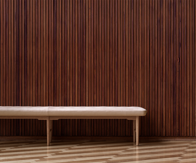 VLA75 Foyer Bænk. Foyer-serien består af en bænk, en sofa og en lænestol, der alle kendetegnes ved et karakteristisk sammenspil mellem stellet i egetræ og de polstrede sæder og rygge, som nærmest svæver. Serien er omhyggeligt polstret i tekstil eller læder, og det kræver præcist og tidskrævende polsterarbejde at færdiggøre sæder og rygge med de håndlavede knapper. Armlæn og ben på både sofa og stol samles af tre dele og håndpudses med største omhu, så de fremstår uden mærkbare overgange. Trods seriens spinkle formsprog er komforten stadig høj grundet de bløde sæder og ryglæn.