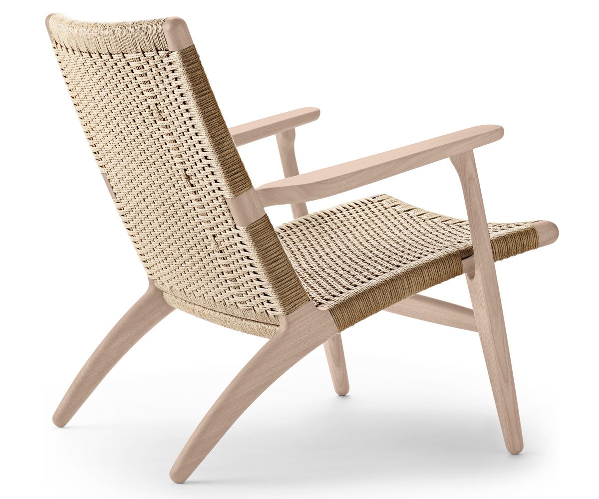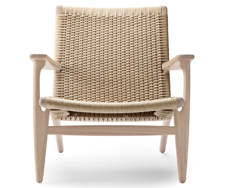CH25 i sæbebehandlet eg. En let og klassisk lænestol, som gør sig lige godt i den moderne stue, som i vinterstuen eller i det åbne køkken. Sæde og ryg er en historie i sig selv. Det er håndflettet i et særligt mønster, som kræver mere end 400 meter papirgarn - og det tager en uddannet fletter 8-10 timer at flette stolen. Papirgarnet fås i natur eller i sort. Designet af Hans J. Wegner i 1950.