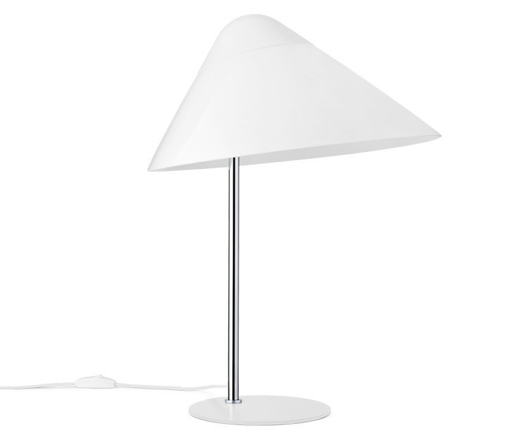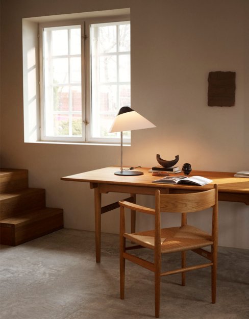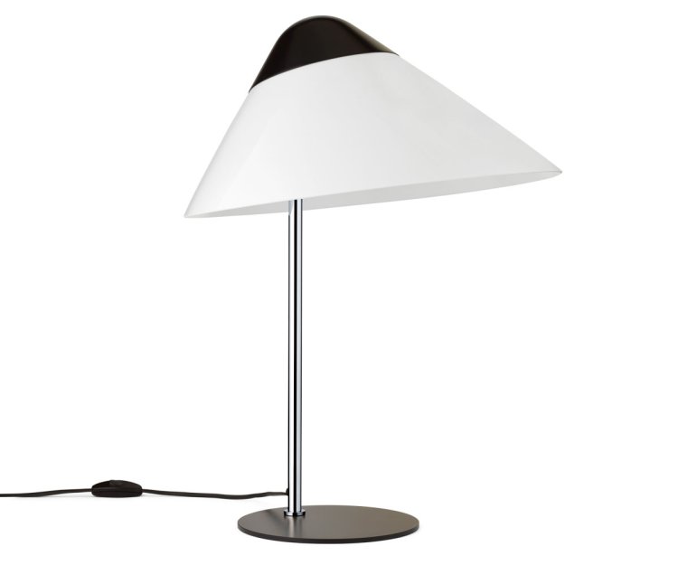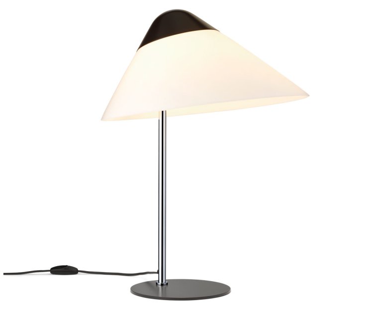 HJW02 Opala Bordlampe Midi, designet af Hans J. Wegner i 1973, er en del af den ikoniske lysserie, som oprindeligt blev skabt til Hotel Scandinavia i København. Denne bordlampe fra Wegner udstråler et markant og futuristisk design med skråtstillede lampeskærme og stramme linjer, som giver den et moderne og stilrent udtryk.