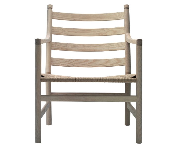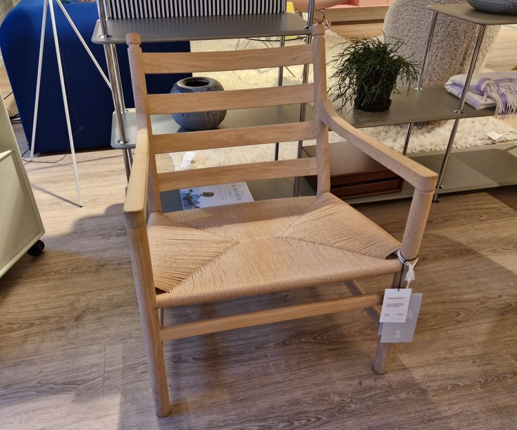 Smuk og veludført lænestol i let stil, som er meget behagelig at sidde i. Den er nem og hurtig at flytte rundt på og ideel i rum, hvor fleksibilitet og lethed er ønsket. Sædet er håndflettet af papirgarn, og fås i ubleget/natur eller sort. Hynder kan fås til i stof eller læder efter ønske. Designet af Hans J. Wegner i 1965.
