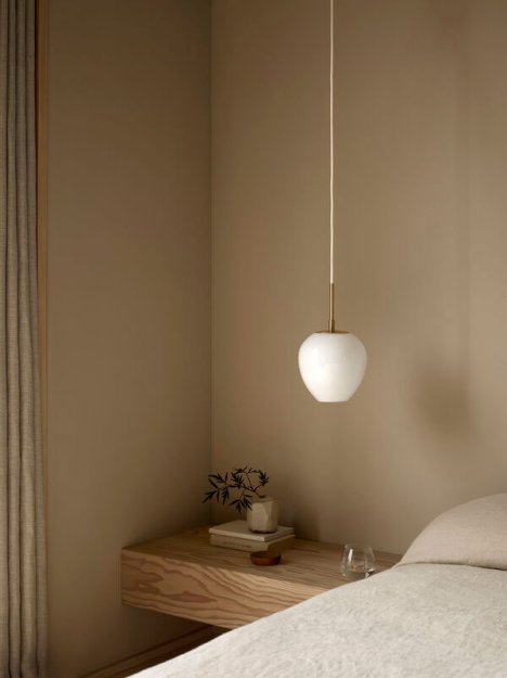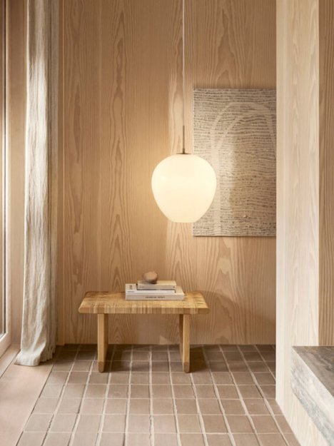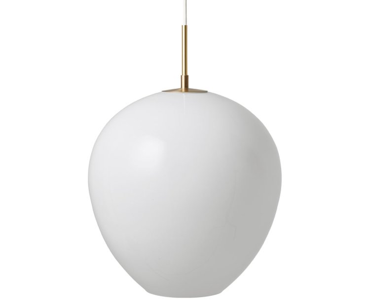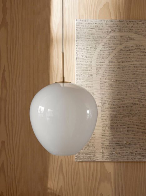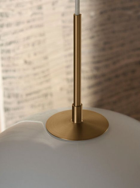 Ophænget i børstet messing er tænkt som en naturlig forlængelse af skærmens bløde former og bidrager til lampens organiske silhuet. Resultatet er en pendel, der emmer af håndværksmæssig finesse og raffineret, nordisk enkelthed.
