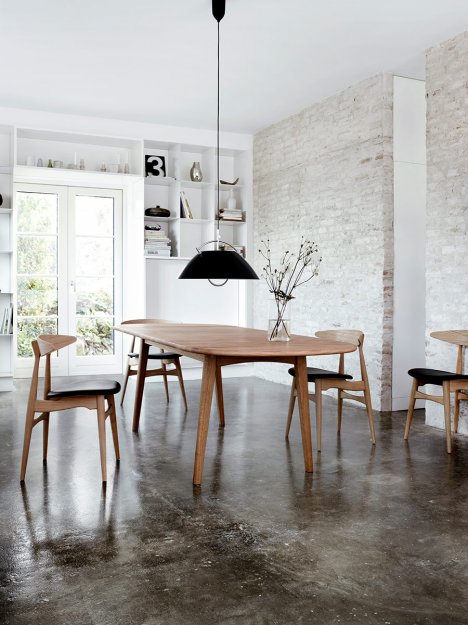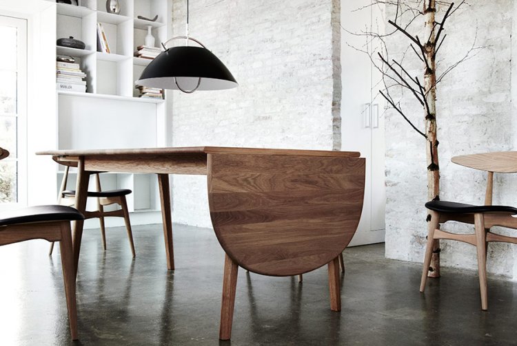 Enkelt og stilfuldt bord, der måler 90x138 og 236 cm. med klapper slået ud. Bordklapperne er monteret med hængsler og løftes hurtigt, når I er et større selskab. Bordpladen fås som standard med runde bordkantsprofiler, men kan også bestilles med lige. Bordklapperne, der følger med, leveres standard som ovale, men kan også bestilles som rektangulære. Designet af Hans J. Wegner i 1982.