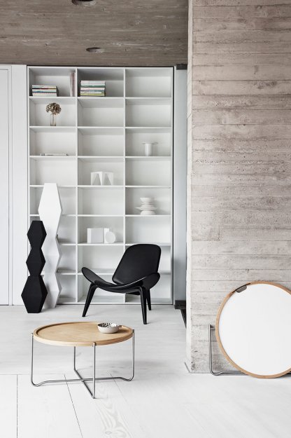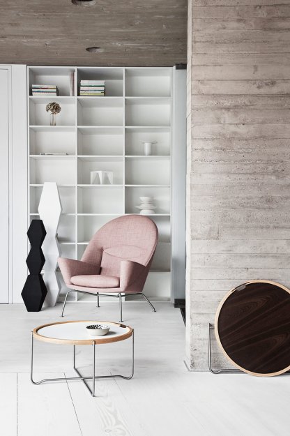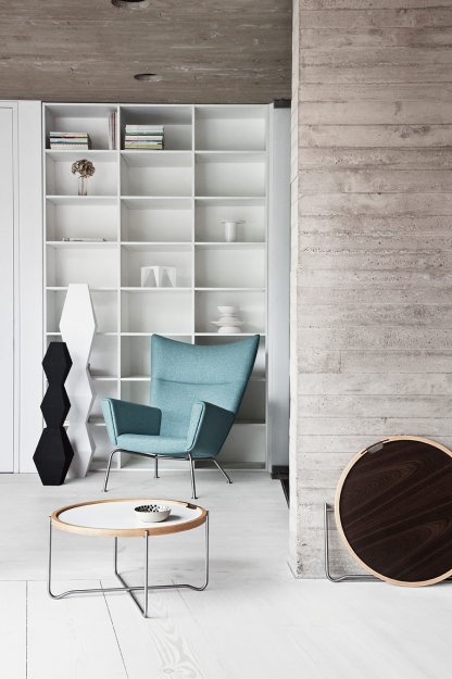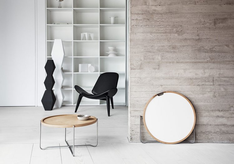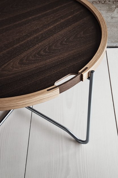 Hans J. Wegners bakkebord er et enkelt og fleksibelt design, der består af to dele - en rund bakke og et sammenklappeligt stel - og kan således benyttes som både sofabord og bakke. For at understrege bordets multifunktionelle karakter er bakken designet med et elegant integreret håndtag, der samtidig udgør et dekorativt element i sig selv - en velkendt Wegner signatur.