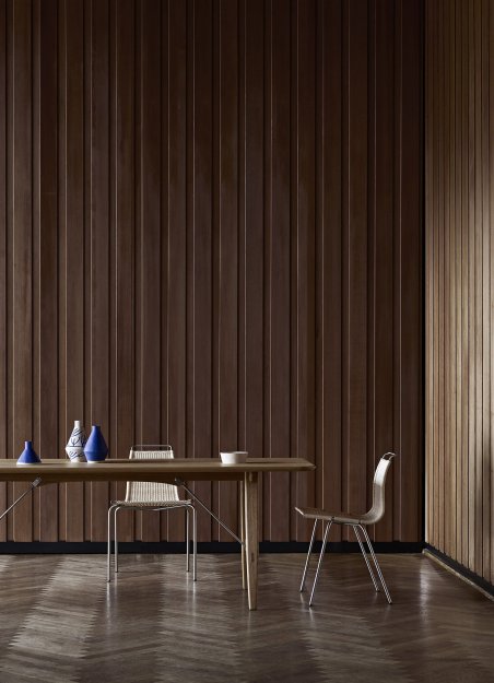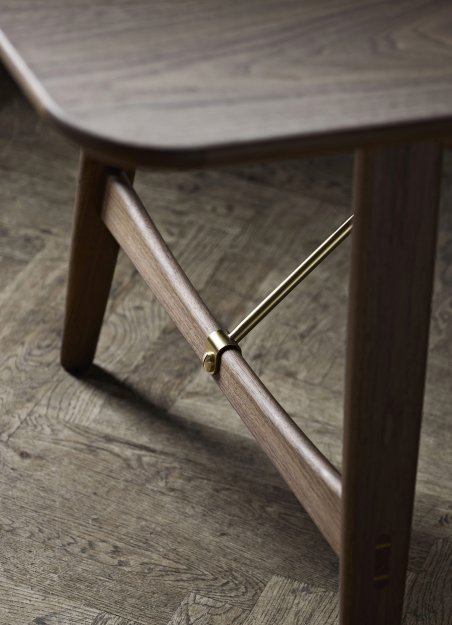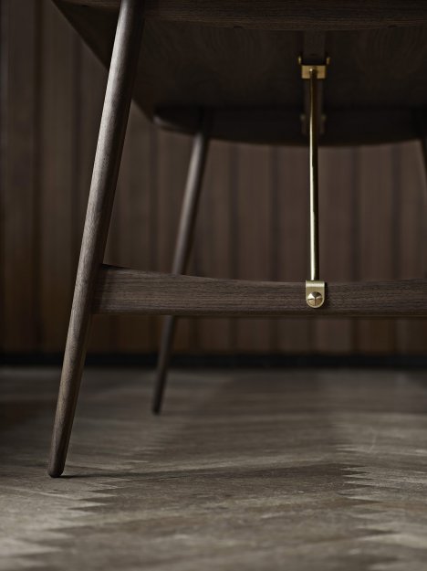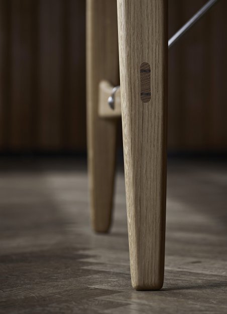 Børge Mogensens Jagtbord, der oprindeligt var tænkt ind i et maskulint miljø i skikkelse af en jagtstue, udstråler en imødekommende og organisk elegance. Bordet består af to bukke med skråtstillede ben og en slank bordplade i finér med runde hjørner og kanter i massivt træ, der vidner om exceptionelt håndværk. En anden elegant detalje er bordbenenes gennemgående tapsamling afsluttet med kiler i kontrasttræ, der accentuerer bordets håndværksmæssige kvaliteter. Stabiliteten maksimeres ved hjælp af to tværstænger monteret mellem stel og bordplade – et funktionelt greb, som også bidrager til bordets meget konkrete æstetik. Den forfinede robusthed blev ganske rammende kaldt for formgivende kunst af en anmelder, da Jagtbordet første gang blev præsenteret i 1950.