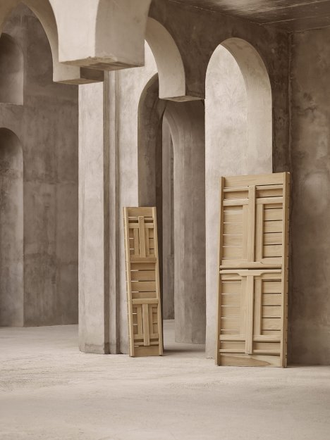 Bordet og bænkene er indbegrebet af en enkel og præcis konstruktion bestående af trælameller, hvilket giver designet et imødekommende udtryk. Sammensætningen af borde og bænke lægger op til, at man samles side om side og nyder det gode, sociale udeliv, og takket være bordets tilbagetrukne understel ender ingen ved en plads, hvor et bordben kommer i vejen. Når middagen er taget af bordet, og sommeren lakker mod ende, kan bænke og bord let foldes sammen og låses med de rustfri stålskruer, der går igen i møblernes samlinger. Den fleksible løsning gør, at sættet kun optager et minimum af plads, når det ikke er i brug.