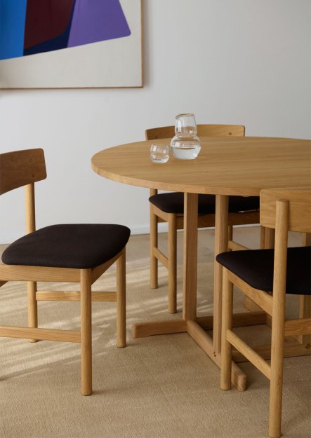 BM6282 har en diameter på Ø120 cm og er udført i massivt egetræ af høj kvalitet. Bordet fås i fire elegante varianter, der hver fremhæver egetræets særlige karakter: