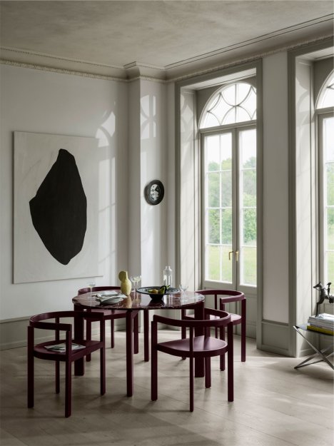 Det runde bord er udført i massivt asketræ med i eksklusiv matslebet rød-hvid marmor. Denne materialitet understreger bordets rolige styrke og giver et raffineret, men naturligt udtryk.