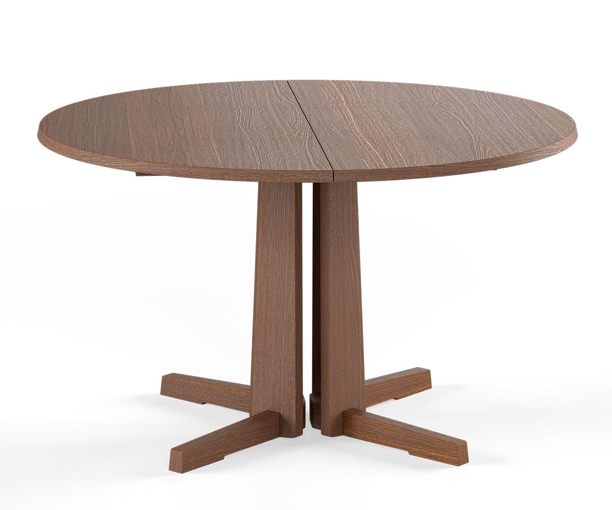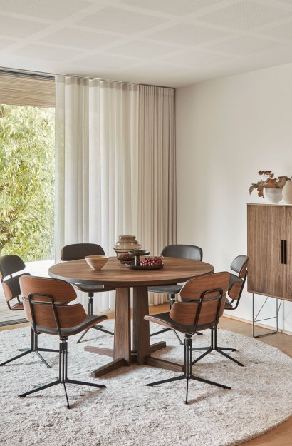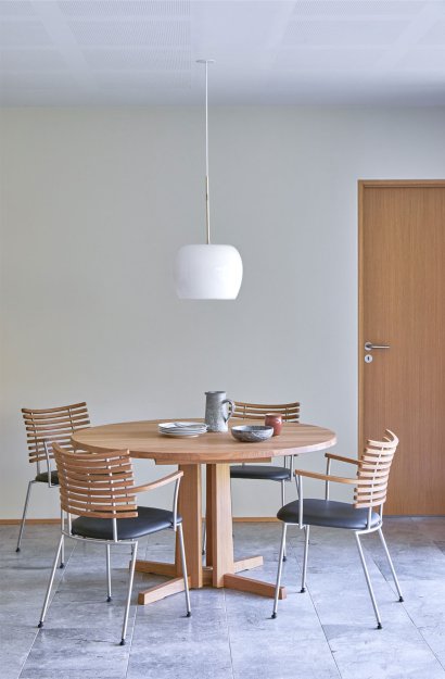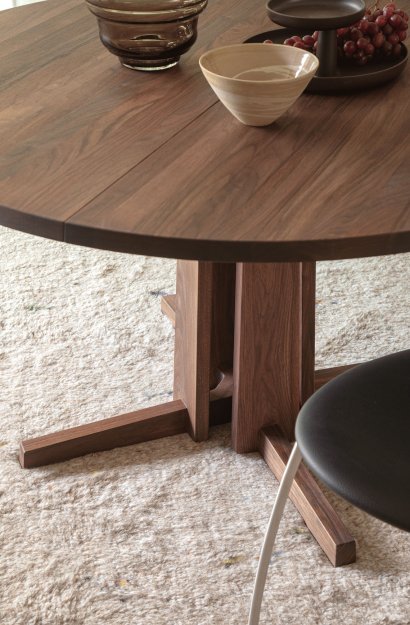 Designet af Gehl & Møller fremstår GM 3182 som et spisebord, der samler rummet med ro og karakter. Den runde bordplade med sin fint affasede kant synes næsten at svæve over den markante, søjleformede base. Subtile detaljer i både søjle og fod skaber en grafisk balance og understreger bordets klare arkitektur.
