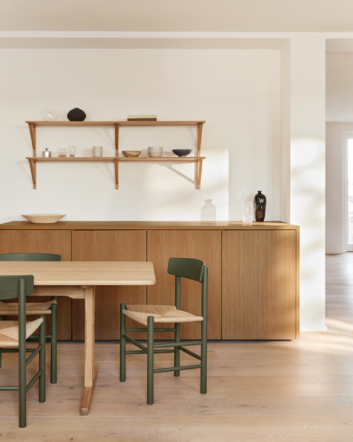 Denne variant i farven khaki er med vandbaseret lak malet på bøgetræ, der giver en flot, glat overflade og i en nedtonet farve, der nemt kan indpasses enhver indretning og bibringe en stemningsfuld farvefortælling uden at tage over i rummet.