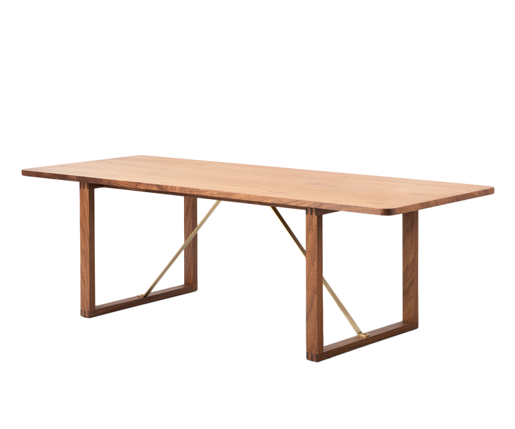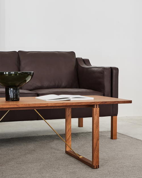 Stilrent sofabord med flotte detaljer fra Fredericia Furniture, designet af Børge Mogensen i 1956. Sofabordet BM67 er fremstillet af egetræ eller valnød med afstivere i messingfarvet metal.
