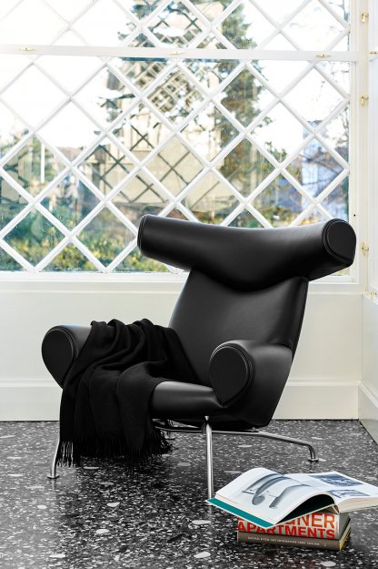 Ox Chair er indbegrebet af maskulinitet. Med sin stramme formgivning har Wegner skabt den ultimative hvilestol, der med sin skulpturelle tyngde er lidt af en cliffhanger. Siden sin fødsel i 1960 har Ox Chair naturligt nok været på ikonlisten over møbel-must-haves. Vælg sort læder for den ultimative show off eller polstrer den med en indbydende tekstil, der emmer af retro. En udødelig klassiker er altid omstillingsparat.