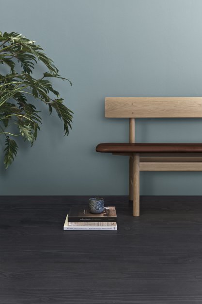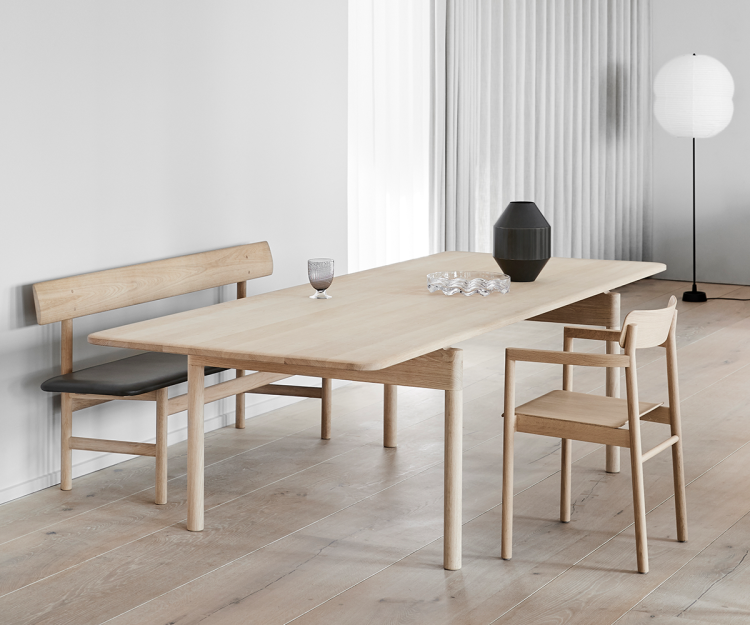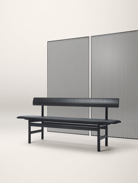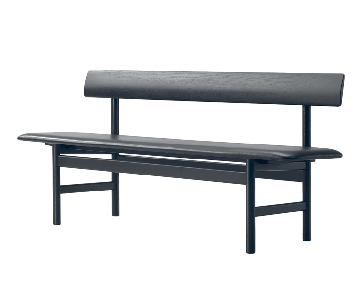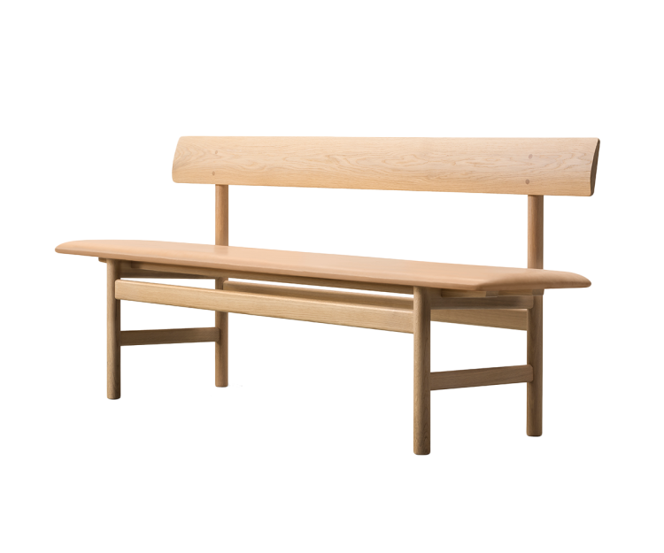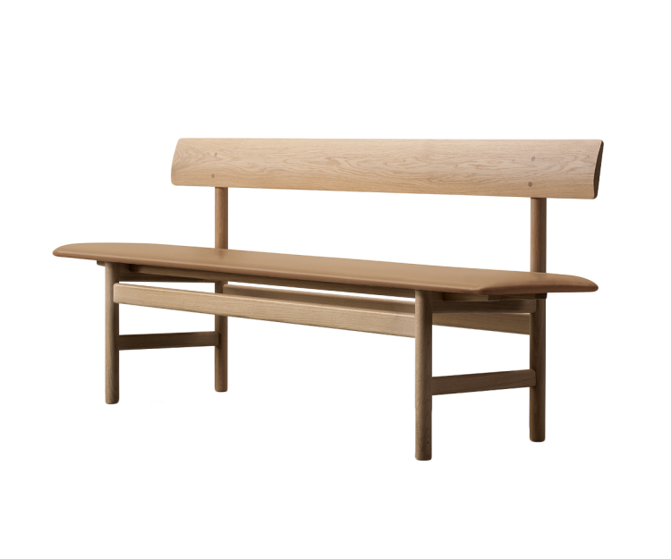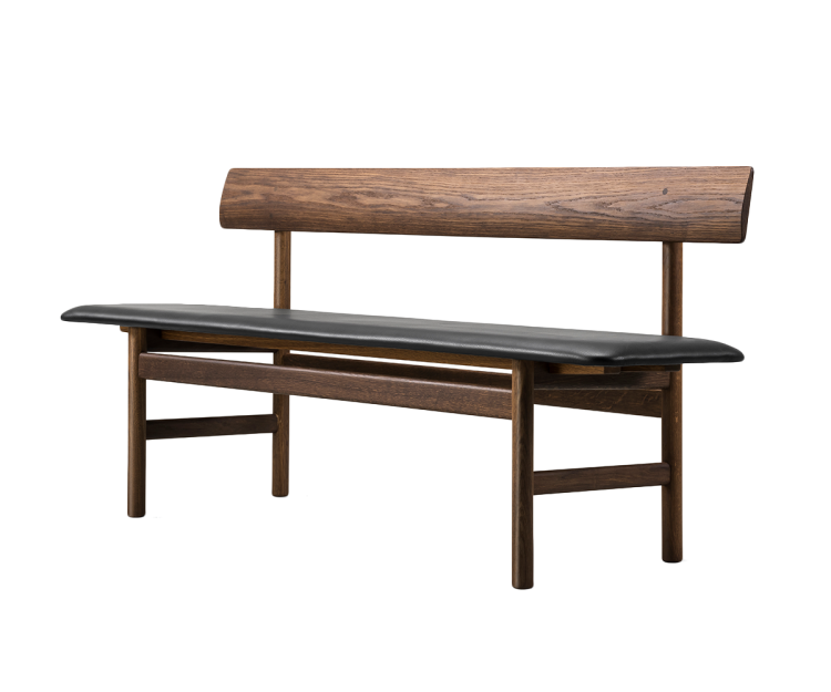 Let og markant bænk i massiv eg med polstret sæde. Bænken er designet af Børge Mogensen i 1956 for Fredericia Furniture, og er med sin robuste enkelthed et eksempel på Mogensens livslange stræben efter en afklaret og renset form.
