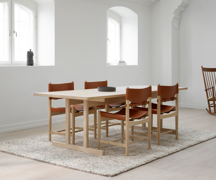 Som andre af Mogensens mest anerkendte møbler er Shakerbordet inspireret af den amerikanske shakerkulturs konsekvente og funktionelle formsprog. Bordets viser Mogensens livslange fordybelse i en stadigt mere afklaret og prunkløs æstetik. OBS: Bordet fås med tillægsplader, der kan forlænge bordpladen med 40 cm i hver ende - ring for pris.