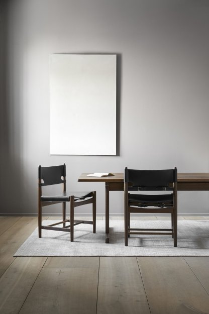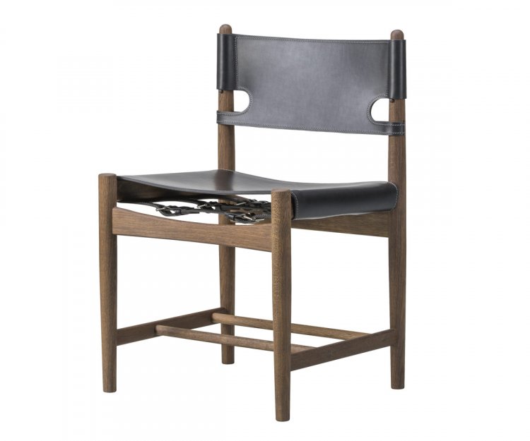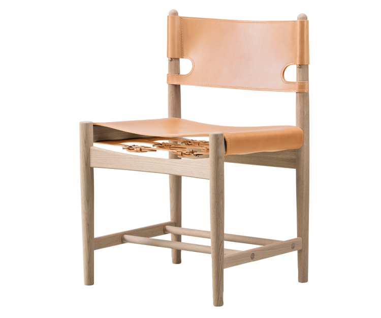 Spanish Dining Chair er et mønstereksempel på, hvad man kan få ud af at anvende ærlige og autentiske materialer. Stolen, som er fremstillet af det fineste egetræ og sadellæder af højeste kvalitet, fås med eller uden armlæn, og i flere forskellige versioner i lyse eller mørkere nuancer, afhængigt af hvilken atmosfære man ønsker at skabe. Den Spanske spisebordsstol er designet af Børge Mogensen i 1950'erne og genintroduceret af Fredericia i 2018.