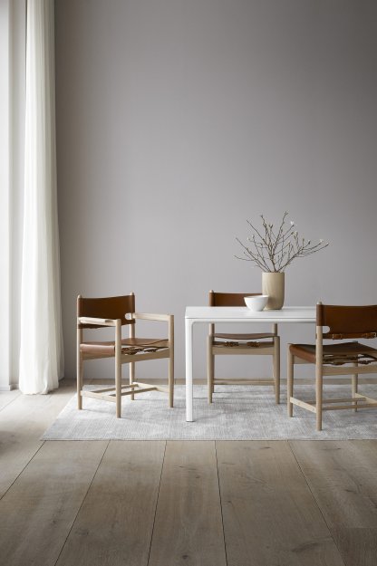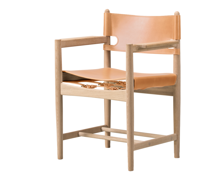 Spanish Dining Chair er et mønstereksempel på, hvad man kan få ud af at anvende ærlige og autentiske materialer. Stolen, som er fremstillet af det fineste egetræ og sadellæder af højeste kvalitet, fås med eller uden armlæn, og i flere forskellige versioner i lyse eller mørkere nuancer, afhængigt af hvilken atmosfære man ønsker at skabe. Den Spanske spisebordsstol er designet af Børge Mogensen i 1950'erne og genintroduceret af Fredericia i 2018.