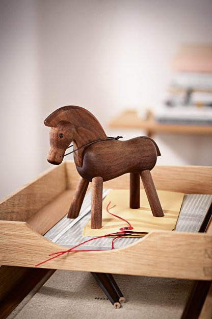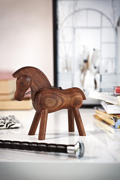 En gaveidé for livet. Denne Kay Bojesen hest så dagens lys første gang i begyndelsen af 1930?erne. Med strunk holdning, kraftig man og tøjlerne klar inviterer hesten til at tage på fantasirejser i munter galop. De bløde former og stive ben giver hesten det typiske udtryk, Kay Bojesens trædyrs familie er kendt for: Muntre linjer uden tanke på at gengive virkelighedens dyr, men derimod fantasifulde varianter, der hurtigt falder til i et hvert hjem. En god gaveidé til konfirmanden, studenten ? til bryllup og alle andre mindeværdige lejligheder.