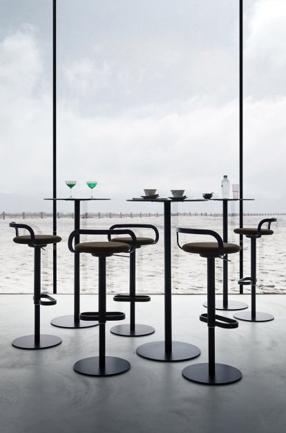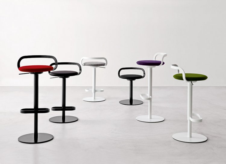 Fransk design flair står bag denne muntre, farverige og dynamiske barstol. En serie af perfekt proportionerede ringe og cirkler danner ryglæn, fodstøtte og sæde. MAK fås med stel, pulverlakeret i sort eller hvid, samt sæde polstret i tekstil eller læder.