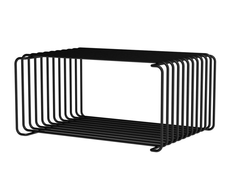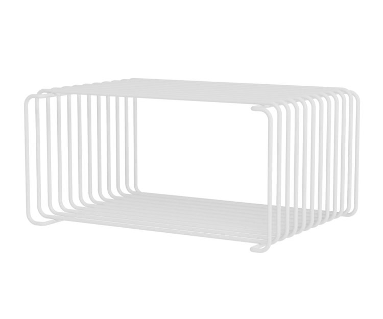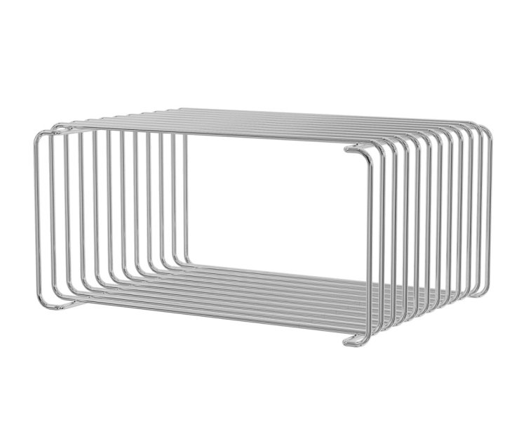 Verner Pantons trådreol er på en og samme tid rå og industriel, let og elegant. Det forkromede stål fanger lyset, men synes alligevel næsten at forsvinde i rummet. Trådreolmodulerne kan bruges enkeltvis eller flere sammen - på gulv, væg eller som rumdeler. Vælg mellem forkromet eller lakeret stål.