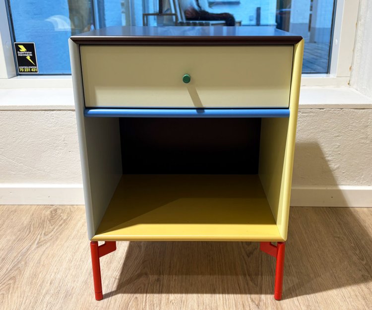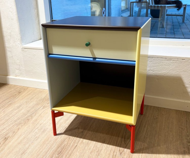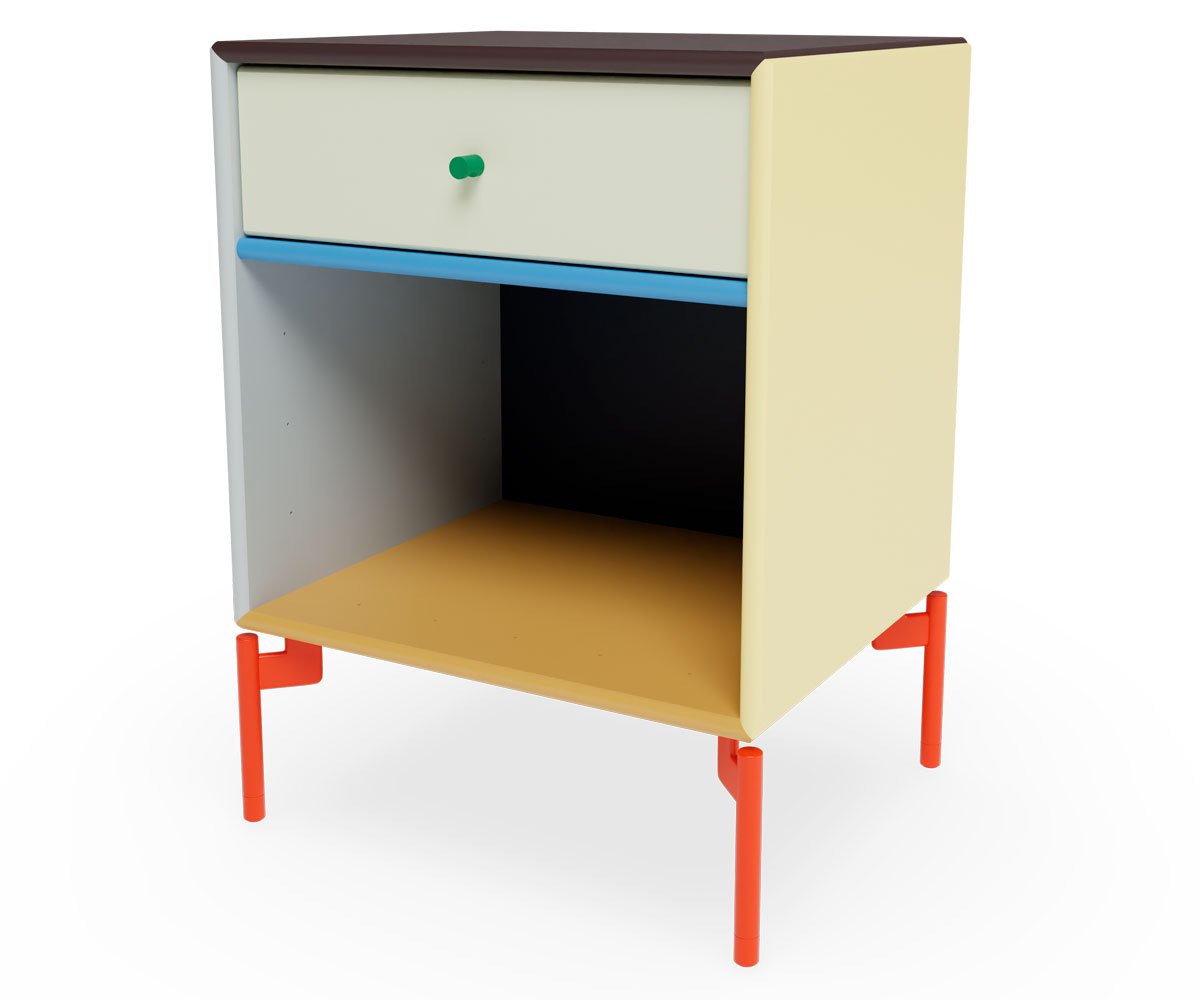 KIMPOP DREAM natbordet, skabt i samarbejde mellem Montana Furniture og KIMPOP, er en farverig ledsager gennem natten og en livlig start på din dag. Stående elegant på slående røde ben, holder DREAM dine vigtigste ting inden for rækkevidde, mens dets dynamiske farver spreder glæde i soveværelset.