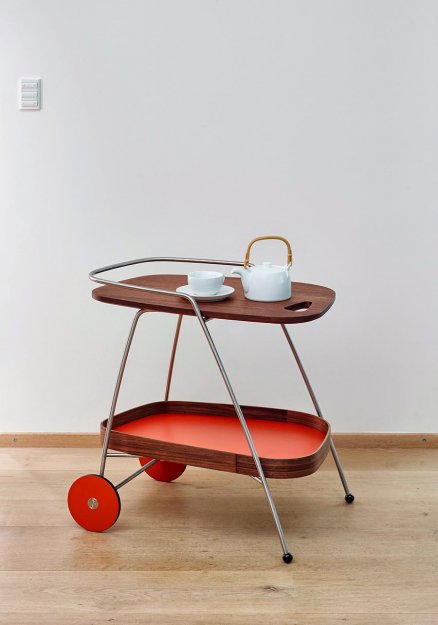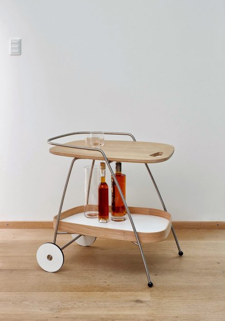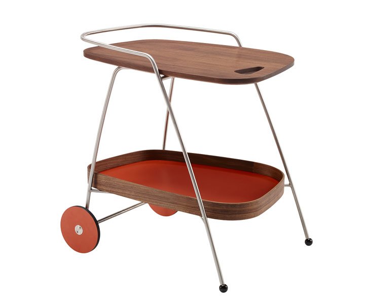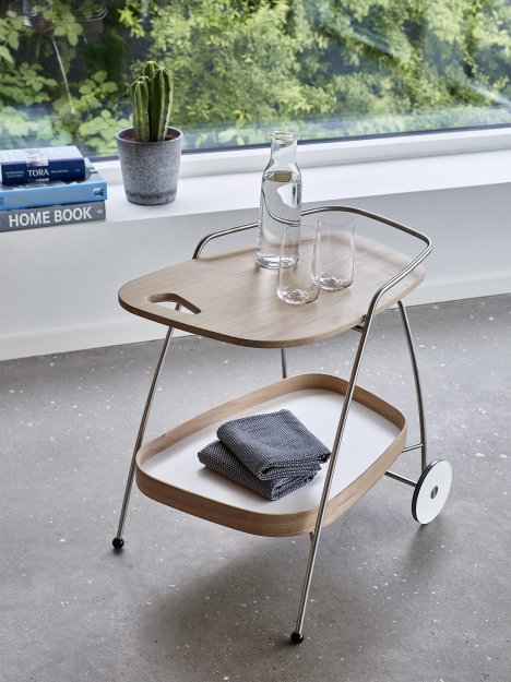Super elegant og let servervogn med rustfrit stål stel, designet af Nissen & Gehl. AK700 er udført med massiv bordplade og med fast monteret bakke. Bakken fås i massiv træ eller med laminat i bunden og på hjul.