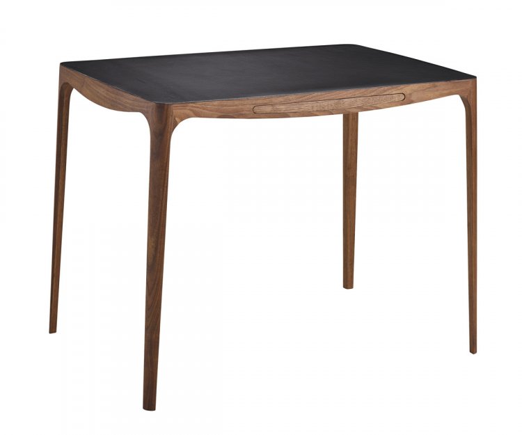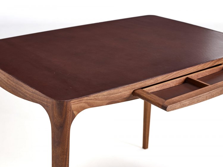 Designet, skabt af Hans Sandgren Jakobsen, forener bløde, runde former med præcise detaljer. Bordpladen er beklædt med eksklusivt kernelæder, som giver en varm og taktil arbejdsflade, mens de elegante gering-samlinger vidner om et højt niveau af håndværksmæssig præcision.