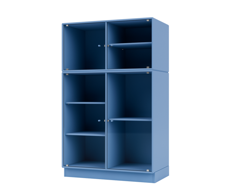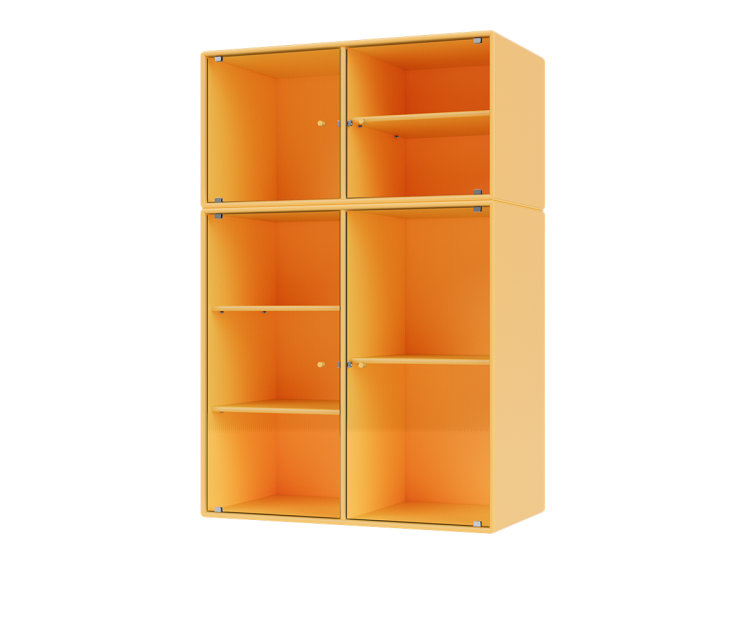 Montana Ripple 3 skab. Montanas Ripple vitrineskabe er moderne og stilfulde nyfortolkninger af det klassiske vitrineskab. De alsidige møbler er ideelle til at fremvise dine elskede genstande og tilføre livlige farver til dit hjem. Med veldesignede glasdøre i riflet glas og justerbare hylder, tilbyder vitrineskabet et frisk twist på traditionelt design. Den asymmetriske placering af hylderne giver dig mulighed for nemt at tilpasse dit vitrineskab, og det riflede glas tilføjer ikke kun visuel interesse, men indfanger og spreder også lyset smukt i hele rummet.