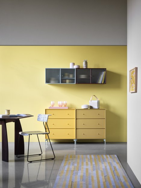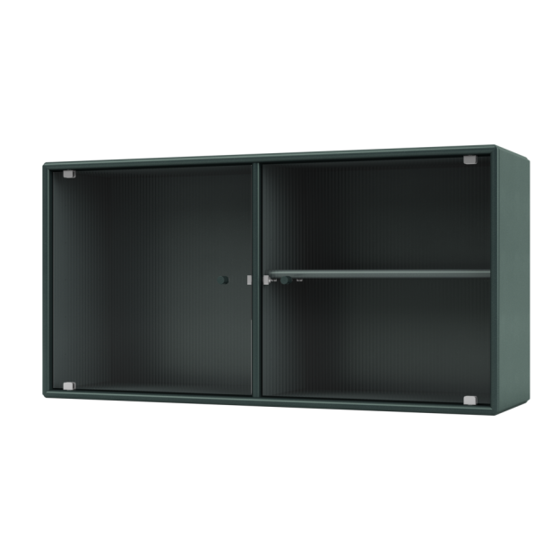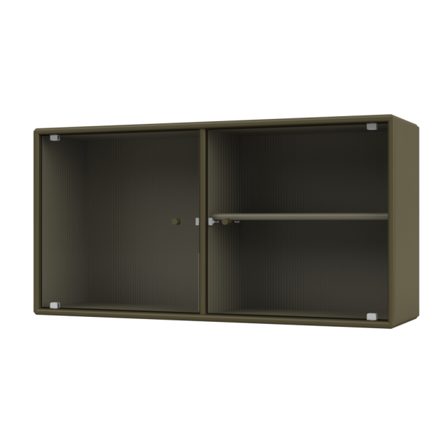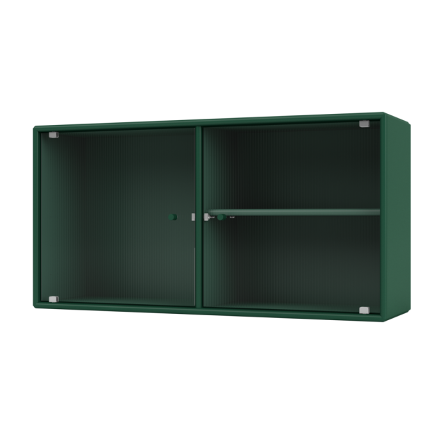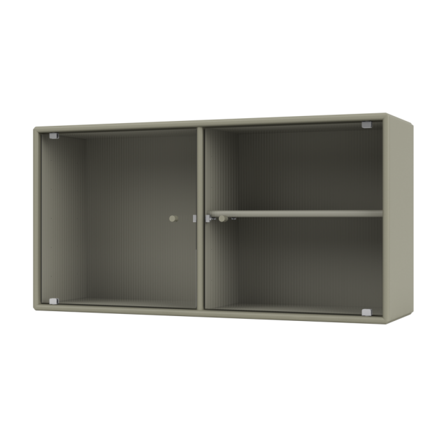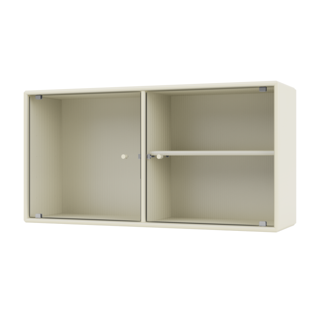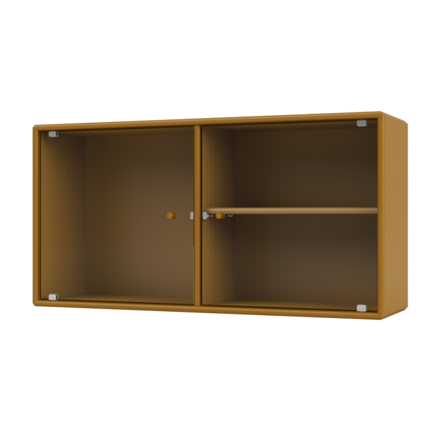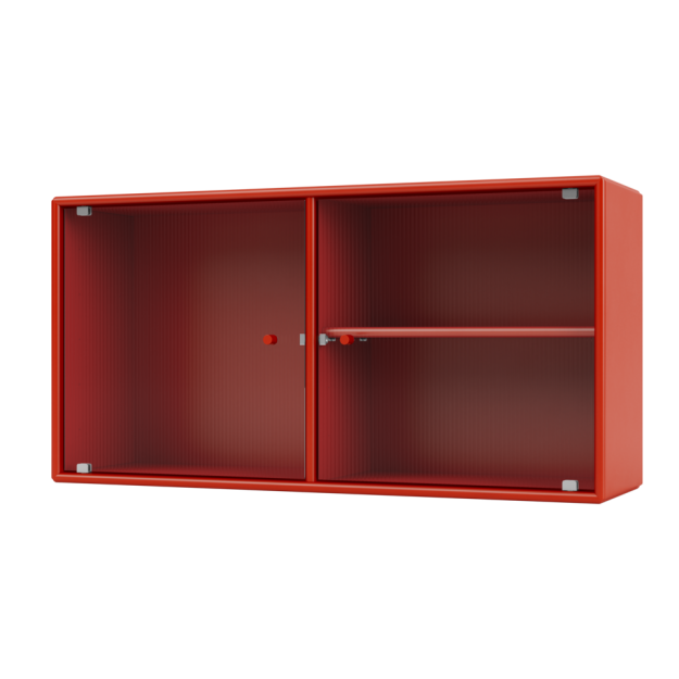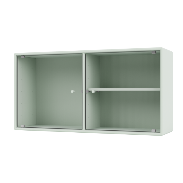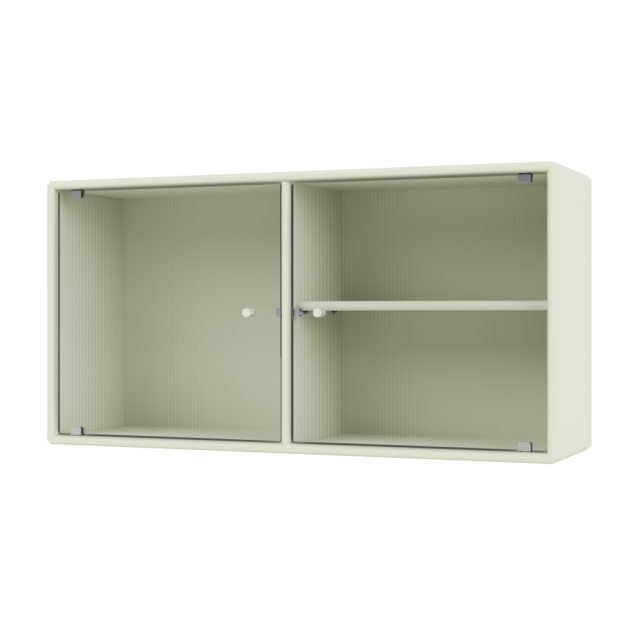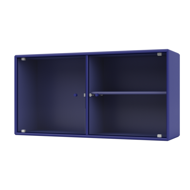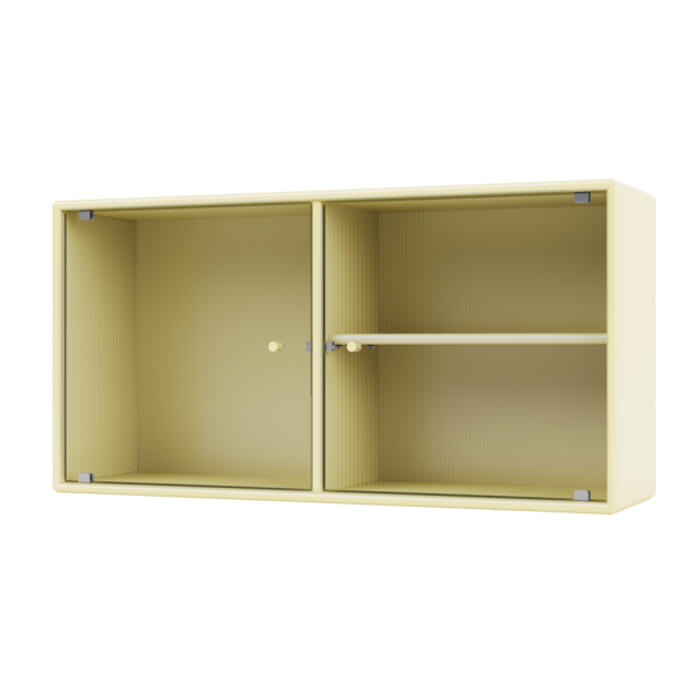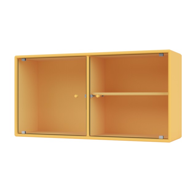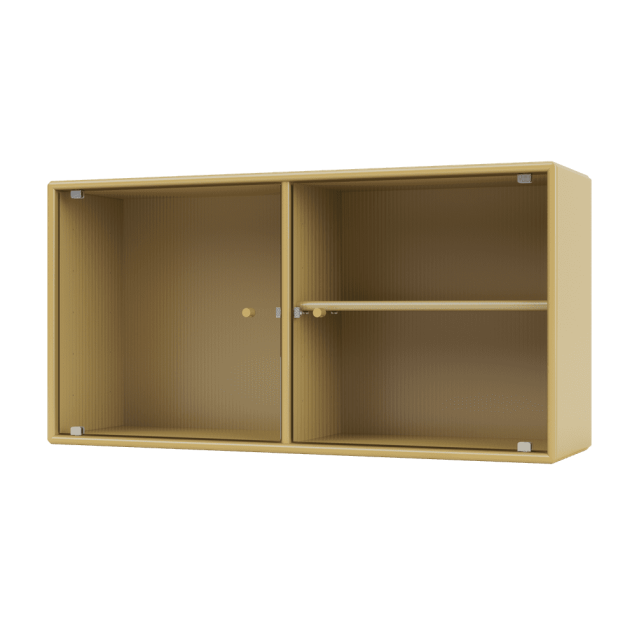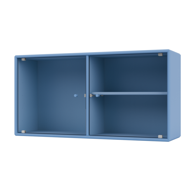 Montana Ripple 1 skab. Montanas Ripple vitrineskabe er moderne og stilfulde nyfortolkninger af det klassiske vitrineskab. De alsidige møbler er ideelle til at fremvise dine elskede genstande og tilføre livlige farver til dit hjem. Med veldesignede glasdøre i riflet glas og justerbare hylder, tilbyder vitrineskabet et frisk twist på traditionelt design. Den asymmetriske placering af hylderne giver dig mulighed for nemt at tilpasse dit vitrineskab, og det riflede glas tilføjer ikke kun visuel interesse, men indfanger og spreder også lyset smukt i hele rummet.