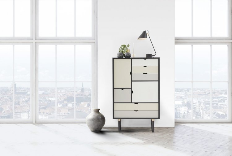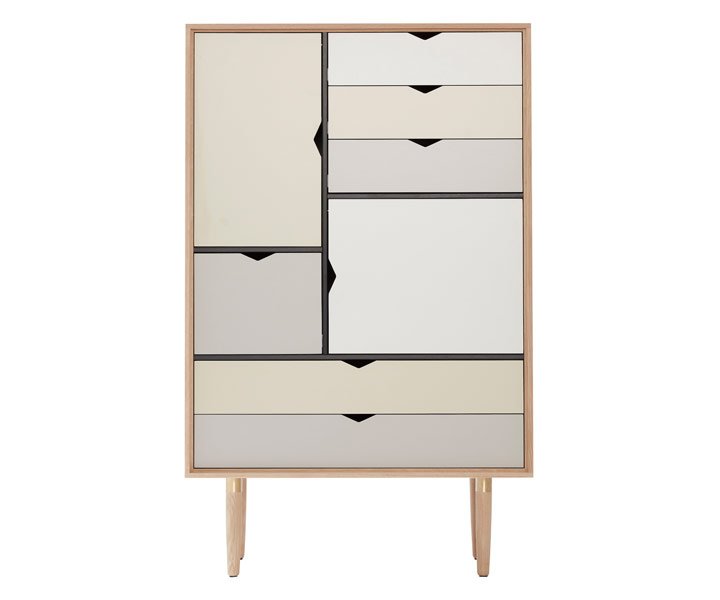S5 opbevaringsmøbel er en variant af det populære S3 møbel - blot i en smallere udgave, som for eksempel kan bruges i indretninger, hvor der ikke er så meget plads. Ligesom de øvrige opbevaringsmøbler fra Andersen, er også S5 skabt med solidt afsæt i det klassiske snedkerhåndværk. Skabet er produceret i massivt træ med tapsamlinger, drejede ben med messingkraver og skufferammer, ligeledes i massivt træ. Der er en smuk finish på møblet og det er et eksklusivt og meget elegant møbel, som samtidigt er praktisk, da det rummer god opbevaringsplads.