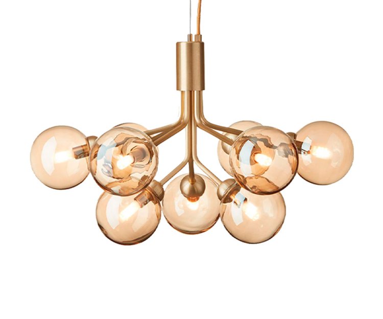 Med inspiration fra blomster har Sofie Refer designet den nye lysekronekollektion, Apiales. Apiales 9 består af ni mundblæste glaskupler og fås i gylden Brushed Brass finish eller fløjsblød Satin Black. Fra en specialproduceret kappe folder de elegante rør sig ud som blomsterstilke og fuldendes af de mundblæste glas, hvorfra lyset spredes med ynde og sanselighed. Apiales 9, passer med sin diameter på 60 cm. over spisebordet, i soveværelset eller hallen.