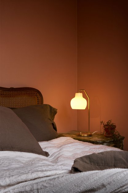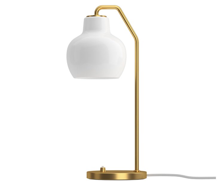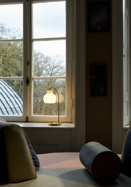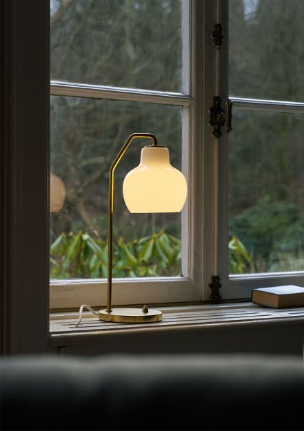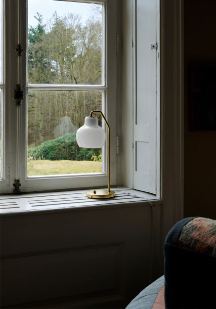 Bordlampen er tro mod det originale formsprog og udført i samme eksklusive materialer: blankpoleret messing og mundblæst, opalhvidt glas i tre lag. Kombinationen af de raffinerede materialer og det enkle, skulpturelle udtryk gør lampen til et smukt supplement til både moderne og klassiske indretninger.
