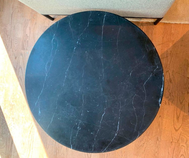 Smukt sofabord med marmorplade og et kryds stel. Floema er en familie af borde, som sammen finder deres karakter igennem minimalistiske linjer. Dette er tydeliggjort i designets runde former, og manglen på kanter, giver beskueren et inviterende og samtidig elegant indtryk