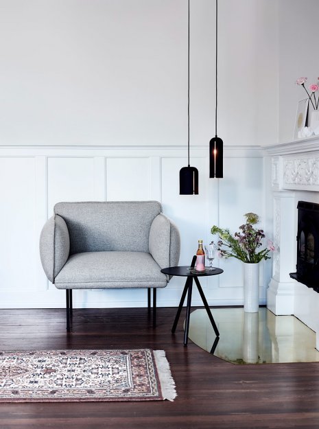 Spændende pendel designet af Maja Bøgh Vindbjerg for danske Woud. Gap består af en rå yderskærm i pulverlakeret metal, og en inderskærm belagt med messing, hvormed du opnår et helt fantastisk lys.