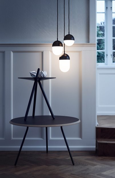 Dot pendlen er designet til at skabe en legende og hyggelig atmosfære i dit hjem. Rikke Frost som har designet pendlen, har især været Inspireret af perforeret metal og de fantastiske mønstre som lyset danner gennem perforeringerne. Dot fås i tre forskellige størrelser, som du kan bruge enten sammen eller hver for sig over f.eks. et køkkenbord eller langt spisebord. Dot fås i sort eller hvid med mundblæst glas.