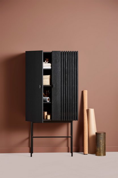 Den geometriske form og lågens riller skaber et stærkt udtryk, som opfanger både lys og skygger. Illusionen af gennemsigtighed er beregnet til at skabe en følelse af nysgerrighed, da man får et lille glimt af, hvad der gemmer sig bag de lukkede låger. De slanke ben tilfører Array et let udtryk og skaber kontrast mellem det tunge korpus og de tynde ben.