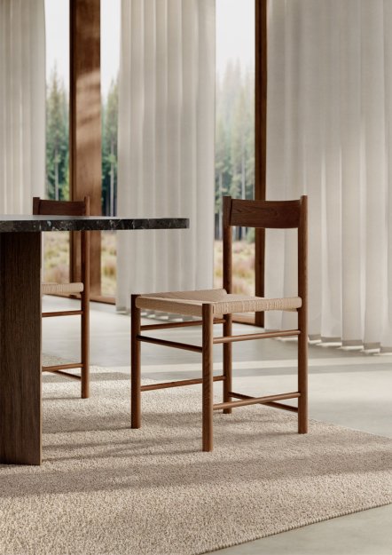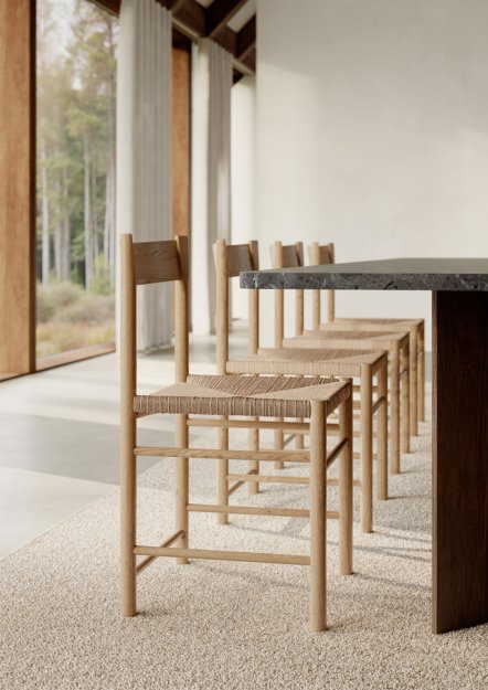 Stolens design er præget af en folkelig klarhed og enkelhed, hvor hver detalje har et formål. Samtidig bringer den et moderne udtryk ind i hjemmet – raffineret og tidløst på samme tid. Papirgarnssædet giver ikke blot visuel lethed, men også en overraskende høj komfort og en slidstyrke, der holder i generationer.