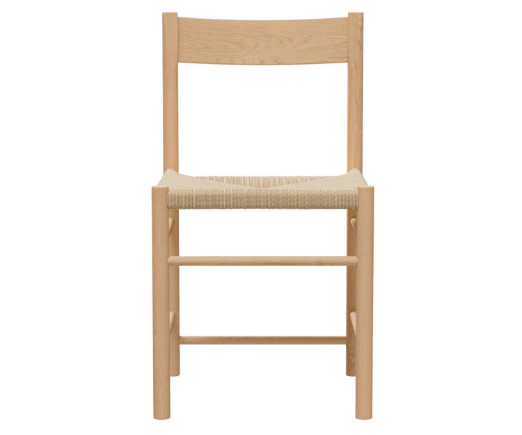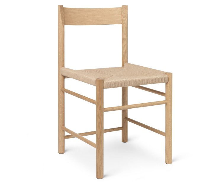 F Chair er en nutidig fortolkning af den klassiske Shaker-stol – et møbel, der forener æstetisk enkelthed med solidt håndværk. Med sit flettede sæde i naturfarvet papirgarn og sin præcist forarbejdede trækonstruktion udstråler stolen en rolig balance mellem det funktionelle og det ærlige.