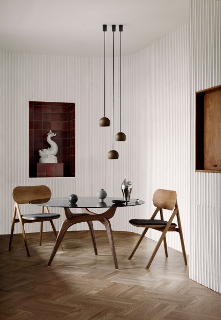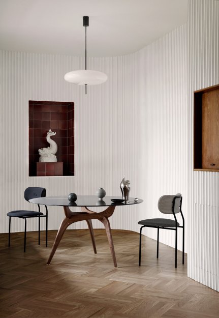 Ved at kombinere en legende konstruktion i træ med en svævende glasbordplade skaber bordene ennærmest poetisk harmoni mellem det enkle og det skulpturelle, værdier, som også kendetegner perioden,hvor bordets første streger blev sat.