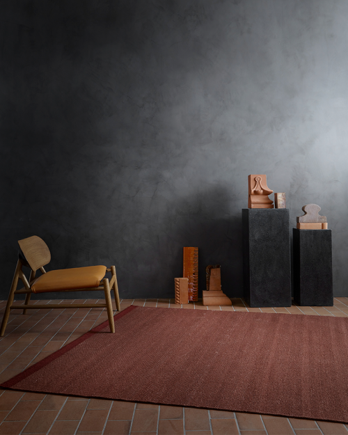 En blanding af den bedste kvalitet New Zealand uld og hør på farvet bomuldskæde giver dette håndvævede tæppe en harmonisk tredimensionel overflade og en meget høj slidstyrke. Det elegante design fremhæves af en kant, der harmonerer med farverne glødende rav, tyttebær, akvamarin og to lette naturlige nuancer.