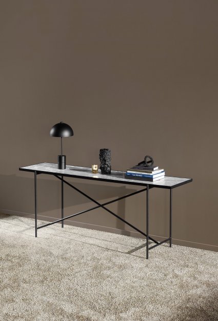 Dette raffinerede stykke design, er en nyfortolkning af det klassiske kakkelbord - med fire stykker marmor monteret i en lang og slank metalramme. Med et Handvärk konsolbord får du et unikt møbel, grundet de forskellige åretegninger i marmoren - ikke ét stykke marmor er ens.
