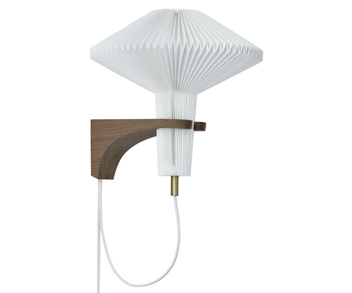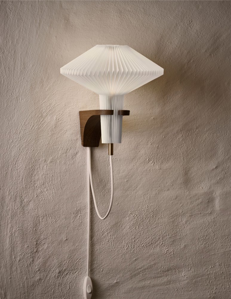 Den elegante væglampe kombinerer naturlige materialer og håndværksmæssig præcision i et udtryk, der stadig føles moderne i dag. Basen fås i ubehandlet lys eg eller røget eg, hvilket giver et varmt og organisk modspil til den klassiske plisserede skærm, som håndfoldes af Le Klints dygtige foldeteknikere i Odense.
