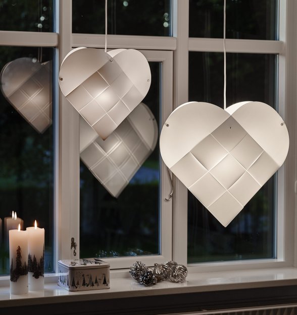 Giv et hjerte til jul, valenstinsdag, fødselsdage, bryllupper - ja, til alle anledninger året rundt. Le Klint's hjerte er flettet i det samme kvalitetsmateriale som de verdenskendte håndfoldede lampeskærme. Hjertet leveres med el-ophæng samt opbevaringsvenlig emballage, som kan genbruges år efter år.